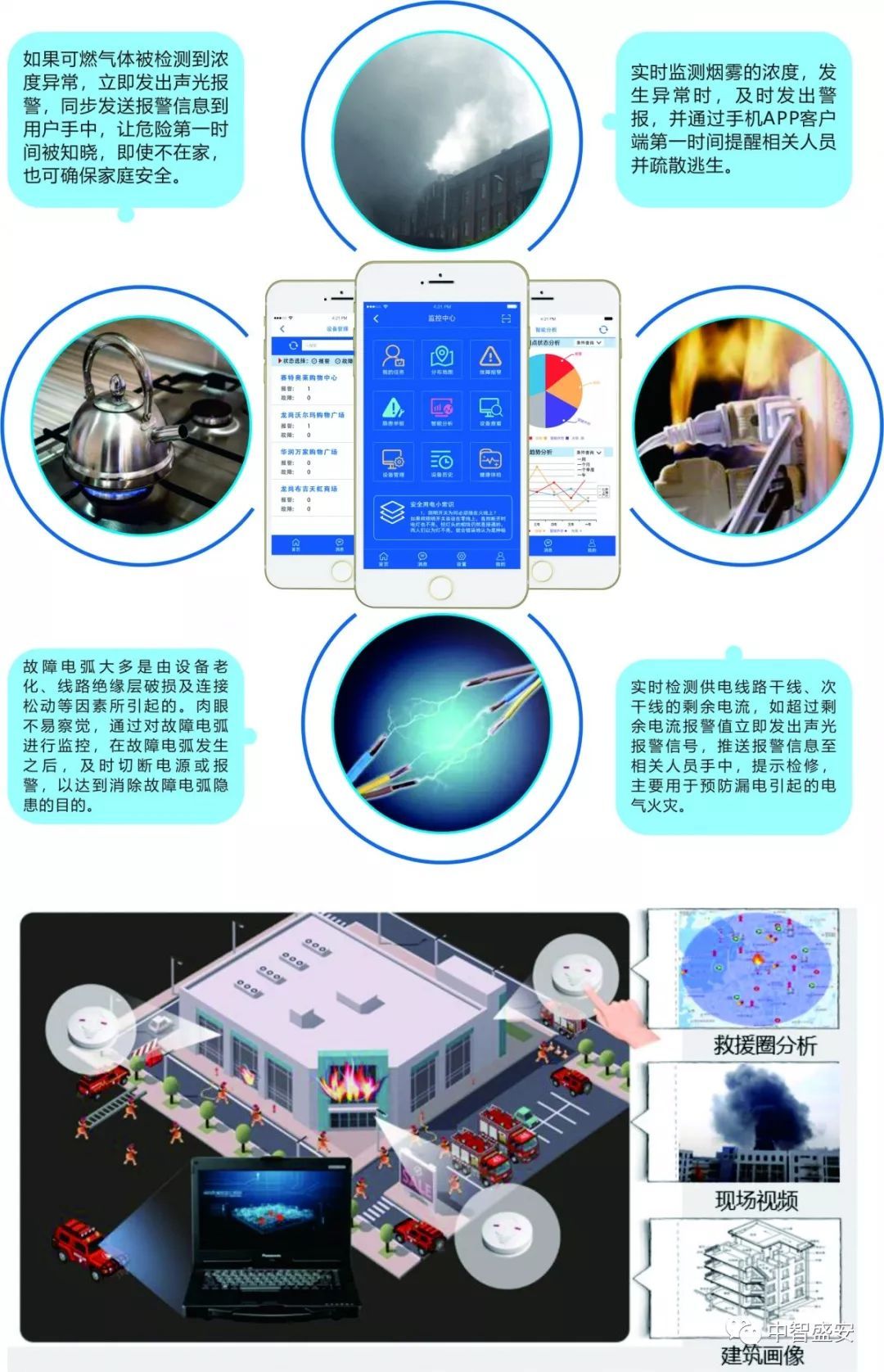 中智盛安自主研發的智慧安全系列品牌產品以信息共建共享、互通互聯、監管群防群治、實時實效,救援聯勤聯動等目標,實現智能預警、迅速響應、合理調配、消防聯動,最大程度保障城市安全。